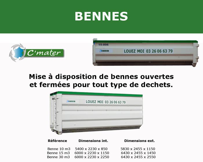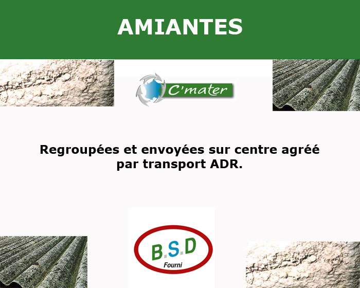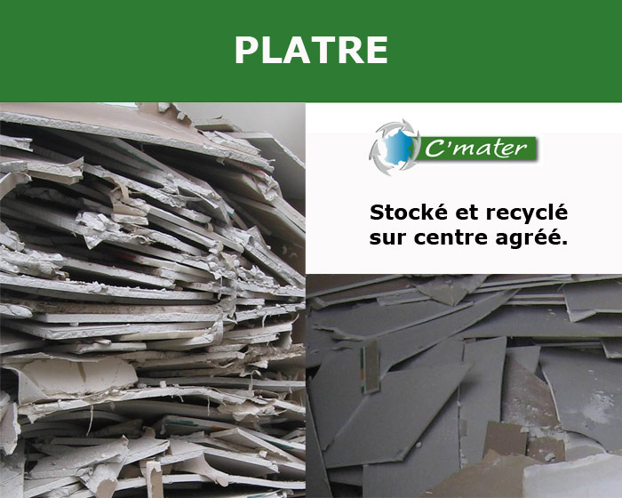 C’MATER accueille : Déchets inertes : gravats, briques, … Déchets valorisables : cartons, plastiques, bois A et B, … Déchets non dangereux et non inertes (DIB) : déchets ultimes, plâtres ultimes, … Déchets dangereux (DIB) : aérosols, filtres, amiante, … C’MATER vous propose : Matériaux :